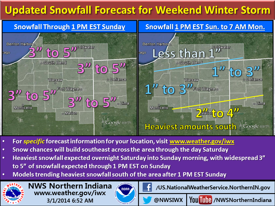 Check the NWS northern Indiana website, www.weather.gov/iwx, for the latest information and to obtain the snowfall forecast for your specific area.